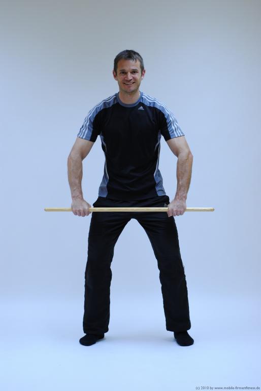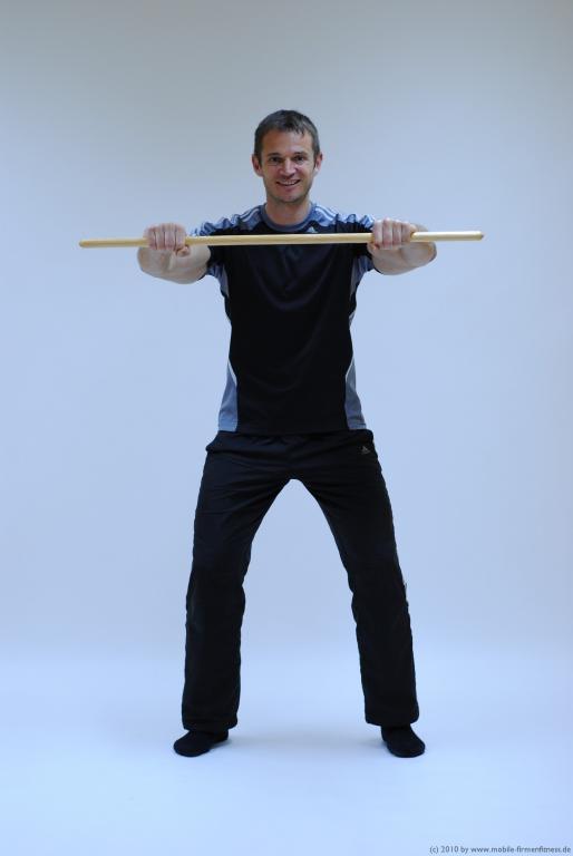 - Stab von oben hüft- bis schulterbreit greifen und parallel zur Hüfte halten